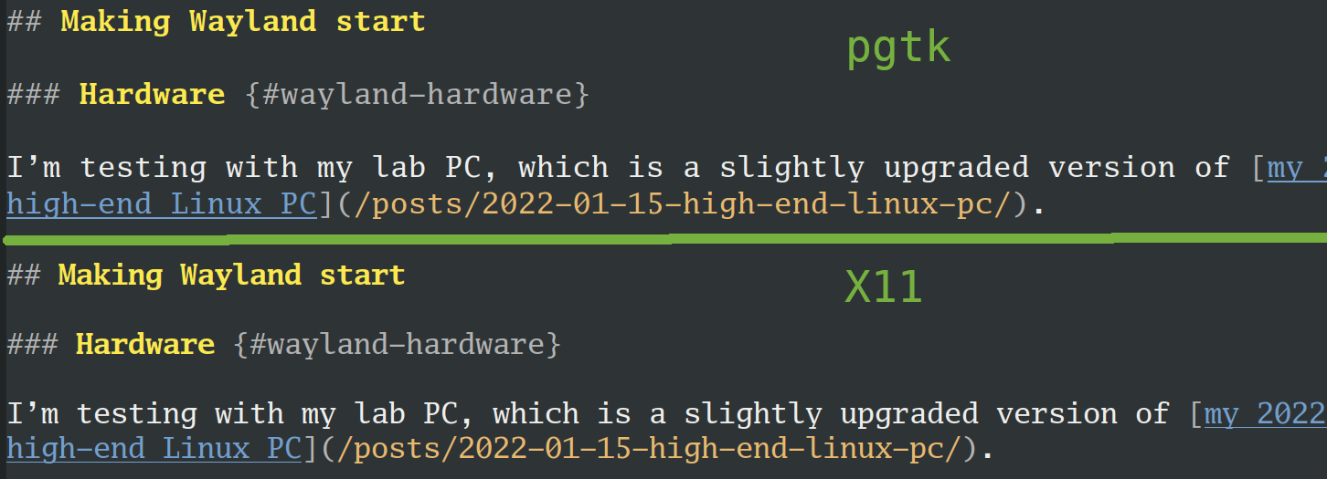 Aside from the different text rendering, the other major issue for me is input latency: Emacs-pgtk feels significantly slower (less responsive) than Emacs. This was reported on Reddit multiple times (thread 1, thread 2) and Emacs bug #71591, but there doesn’t seem to be any solution.