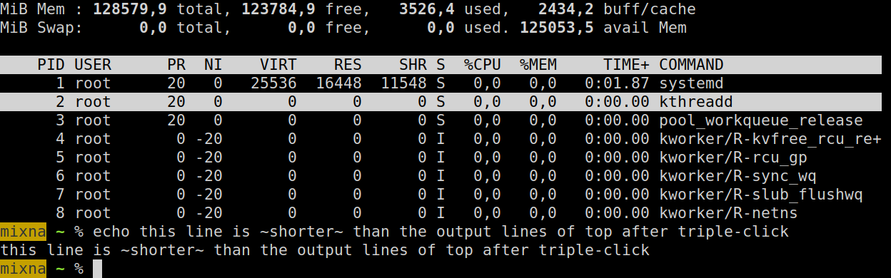 But triple-clicking on an echo output line highlights only the contents, not the whole line:
