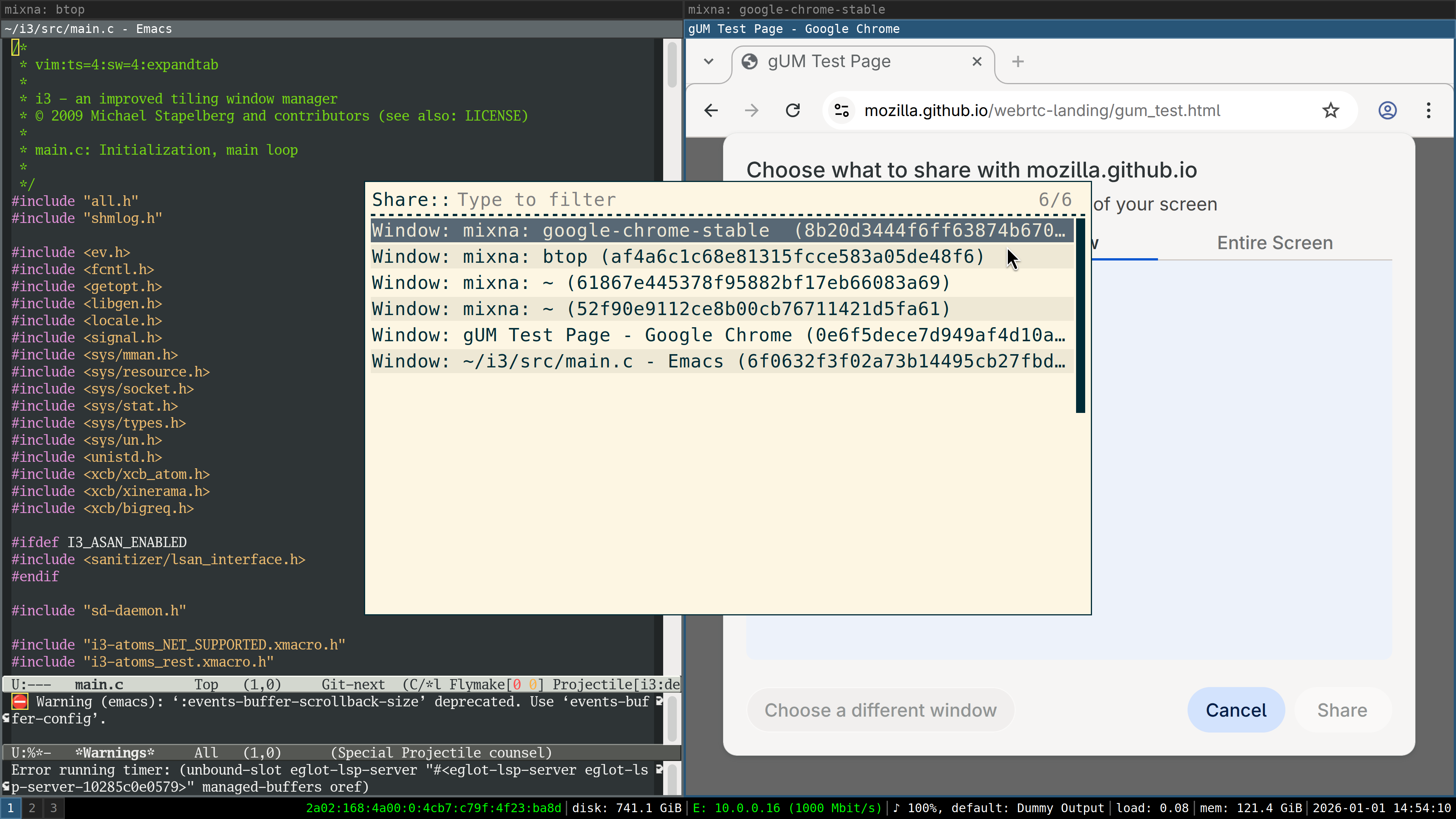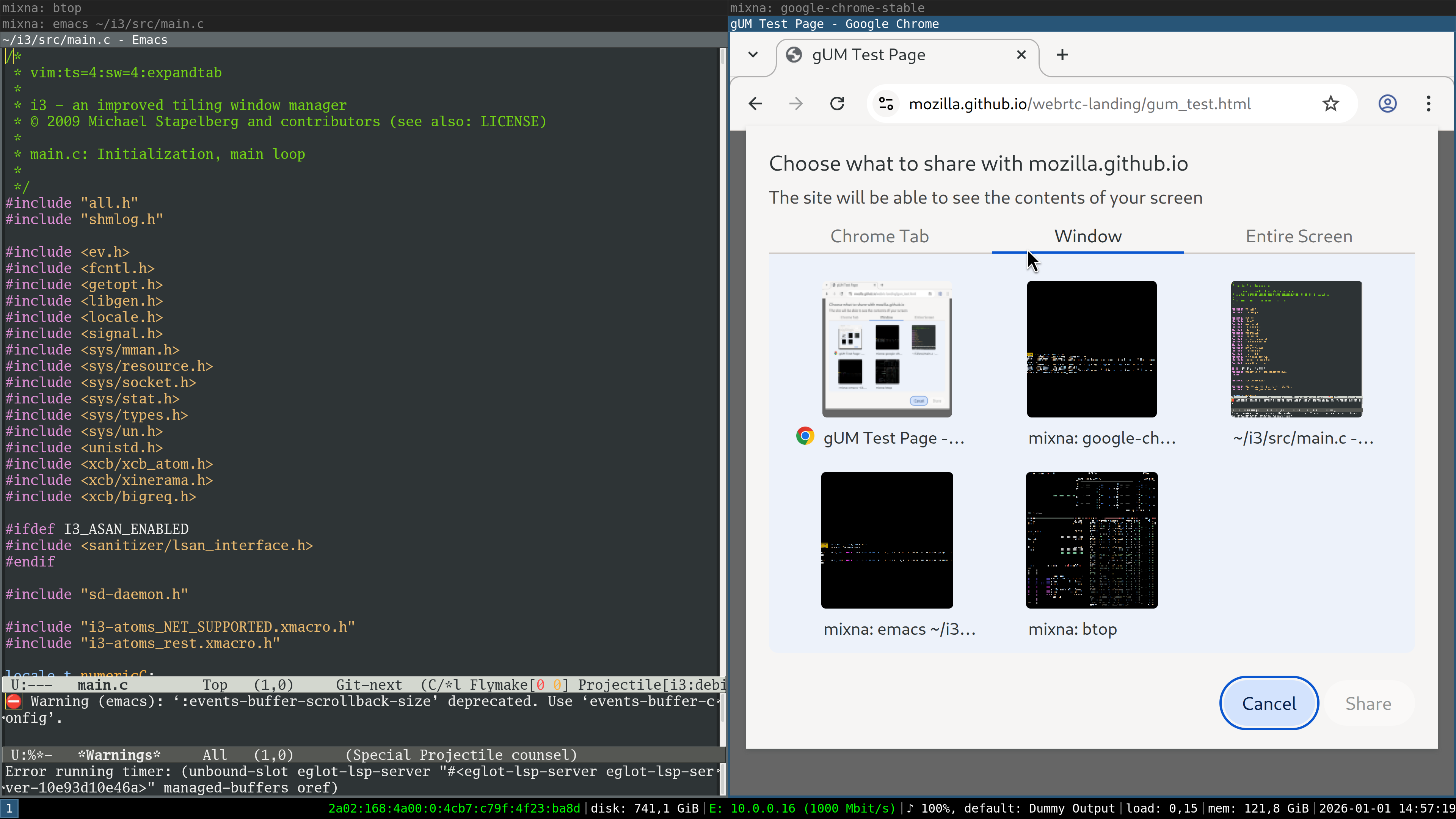 I changed my NixOS configuration to use sway and wlroots from git to try it out. When I click on the “Window” tab, I see a chooser in which I need to select a window: